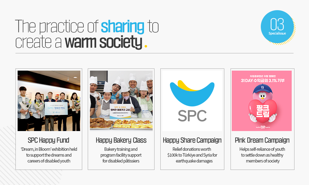 Not only that, we also carried out various global campaigns to spread good influence. In February, we donated $100,000 to the Korean Red Cross through Happy Share Campaign, one of SPC’s social contribution programs, to help Türkiye and Syria affected by the earthquake. The Happy Share Campaign is more meaningful as it highlights the participation of consumers who directly take part in the Happy Story corner of the Happy Point application or donate through the Korean Red Cross site link on the page. In March, in collaboration with the global non-governmental organization (NGO), World Vision, we officially launched the Pink Dream campaign to support the successful independence and dreams of young people preparing for self-reliance, actively encouraging young people to advance into society and providing comprehensive health checkups and also supporting psychological counseling programs.
