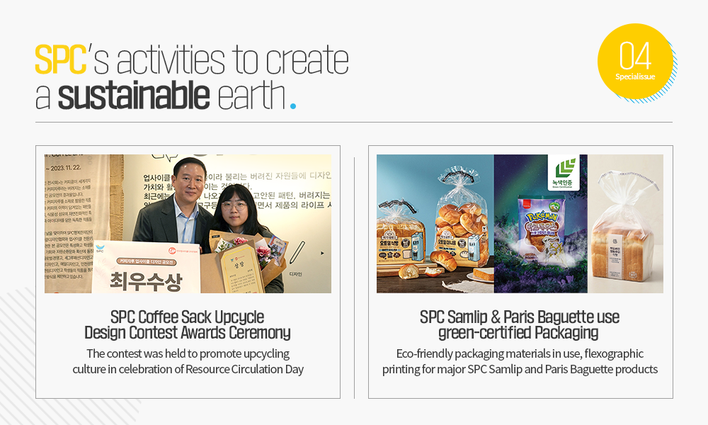 SPC is carrying out various activities to strengthen environmental management. A representative example is the SPC Coffee Sack Upcycle Design Contest held in November. Prior to the contest, we held a Special Upcycling Lecture at schools to help students understand upcycle design, and through an awards ceremony, we publicized the infinite possibilities of upcycle design and helped them demonstrate their capabilities as fashion designers.