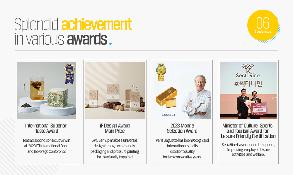 In 2023, an award relay was held in which various organizations recognized SPC’s product quality and design. In January, Teatra won the International Superior Taste Award at the 2023 ITI International Food and Beverage Fair, which evaluates excellent food and beverage products from over 130 countries around the world and grants a certification mark. In May, SPC Samlip’s Meegak bakery won the main prize in the food package category at the iF Design Award (International Forum Design Award) for its gift set package. Paris Baguette won the 2023 Monde Selection, a world-renowned international quality evaluation organization, in recognition of its excellent taste and appearance, winning the Gold Award for two consecutive years.