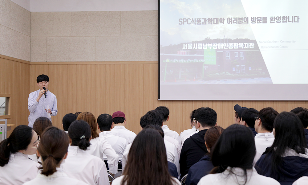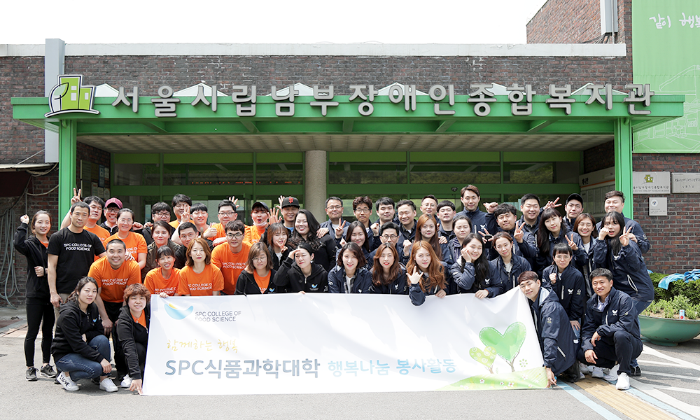 SPC식품과학대학 학생들은 지역사회를 보다 깊이 이해하고 사회공헌 활동에 적극적으로 참여하기 위해 학년별로 봉사 활동을 진행하고 있습니다. 5월을 맞이하여 SPC식품과학대학 1, 2학년 교육생 49명은 서울시립 남부장애인종합복지관을 찾아 지체 장애인 40여 명을 대상으로 케이크 만들기 교실을 열고, 복지관 학생들과 함께 점심을 준비하고 배식하는 노력 봉사활동을 진행했습니다.