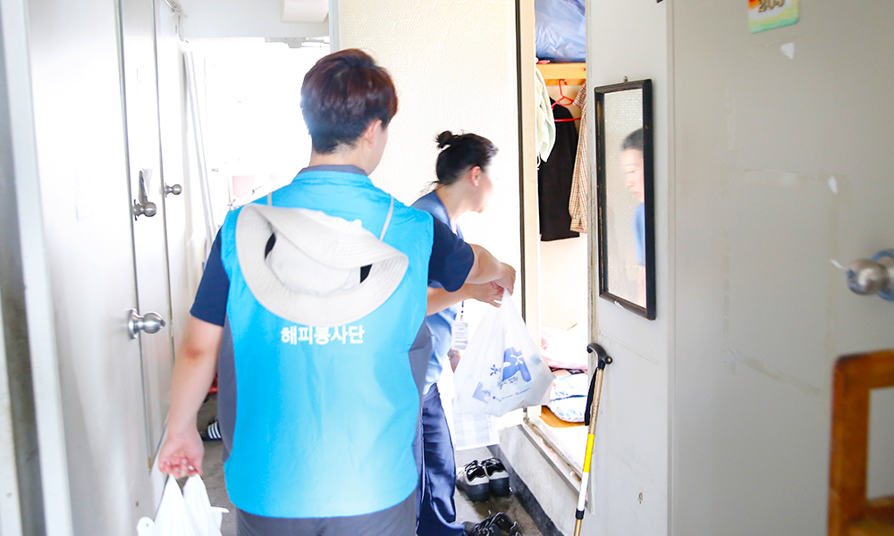 거동이 힘든 거주민에게 구호품을 전달 중인 SPC 해피봉사단