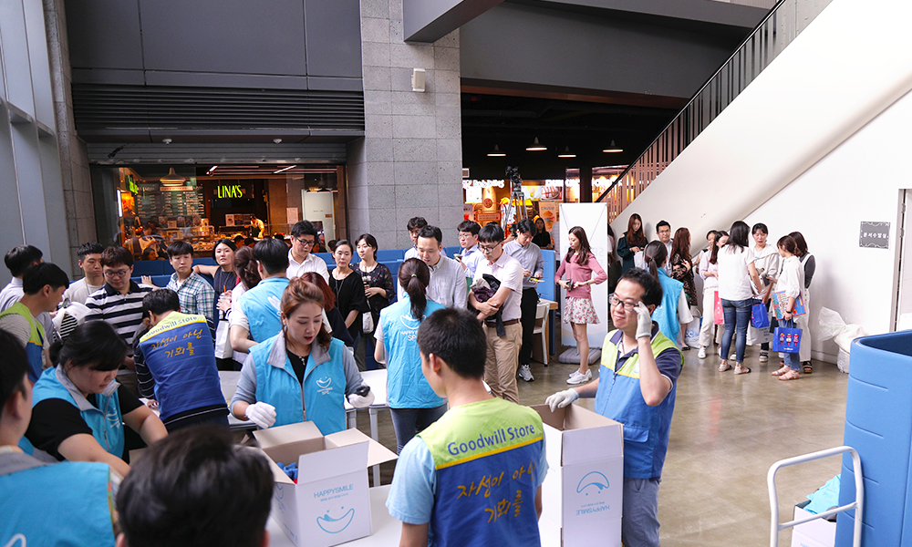 점심시간이 조금 지난 SPC그룹 본사 구내식당 앞에 긴 줄이 늘어섰습니다. 밀알복지재단에서 운영하는 굿윌스토어와 SPC그룹이 함께한 물품 기증 캠페인에 기부할 물건을 들고 기다리는 그룹 임직원들이었는데요. 9월 5일 수요일부터 7일 금요일, 3일 동안 500여 명이 넘는 직원들이 다녀갔습니다.