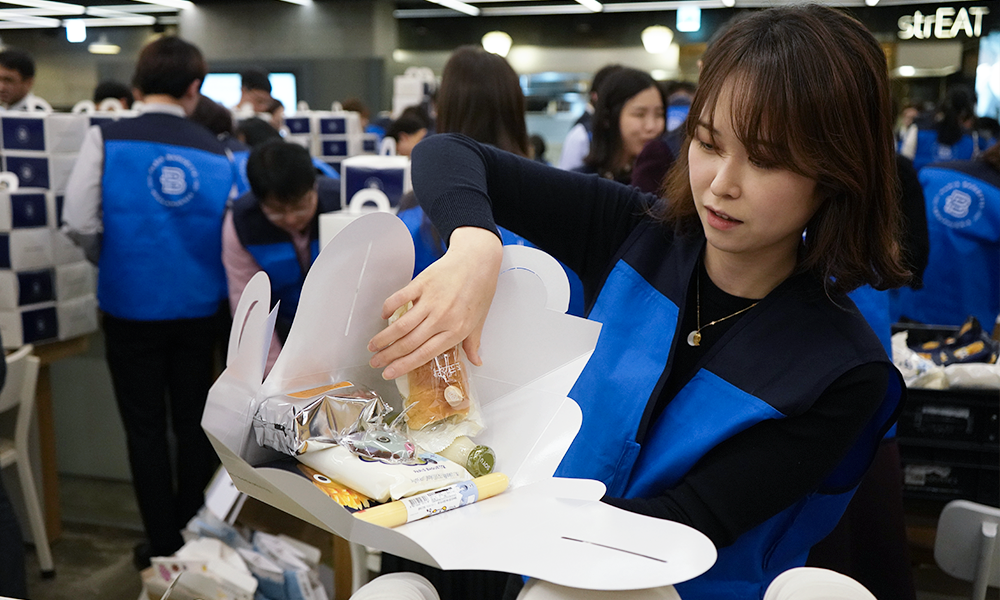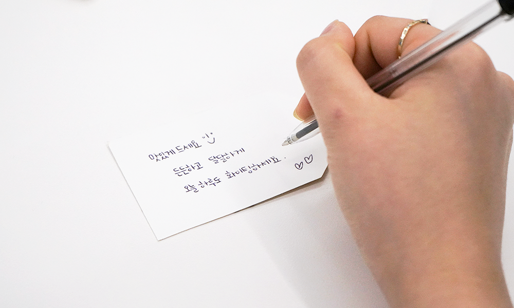 임직원은 포장과 함께 학생들을 응원하는 메세지를 담아 직접 작성한 손편지를 ‘아침 식사 패키지’ 리본에 달기도 하였는데요. 마음이 잘 닿기를 바라는 마음으로 한 글자 한 글자 정성스럽게 작성하는 훈훈한 모습이 연출되었습니다.