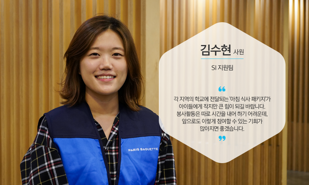 이날 오후 양재사옥에 근무하는 ㈜파리크라상 임직원은 지하 구내 식당에 모여 아이들에게 전달할 ‘아침식사 패키지’ 포장과 배달을 진행했었습니다. 직원들은 최근 드라마에 등장해 선풍적인 인기를 끌고 있는 파리바게뜨 ‘무지개 카스테라’와 ‘초코소라빵’ 등 인기 제품 7종이 담긴 패키지 박스 1,400여 개를 순식간에 포장한 뒤, 월드비전과 결연을 한 전국 110여 개 초등학교와 중학교 학생 1,400여 명에게 직접 전달했습니다.