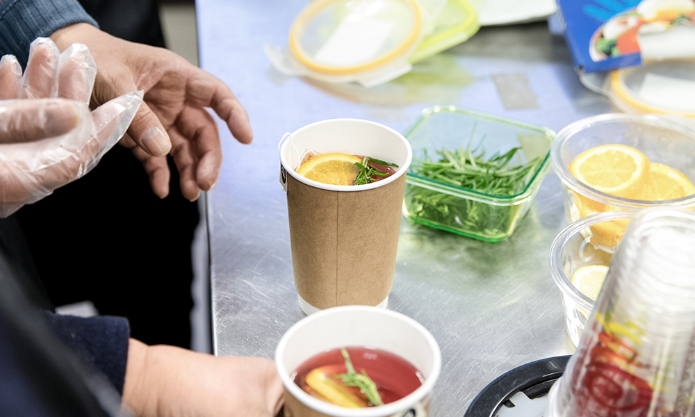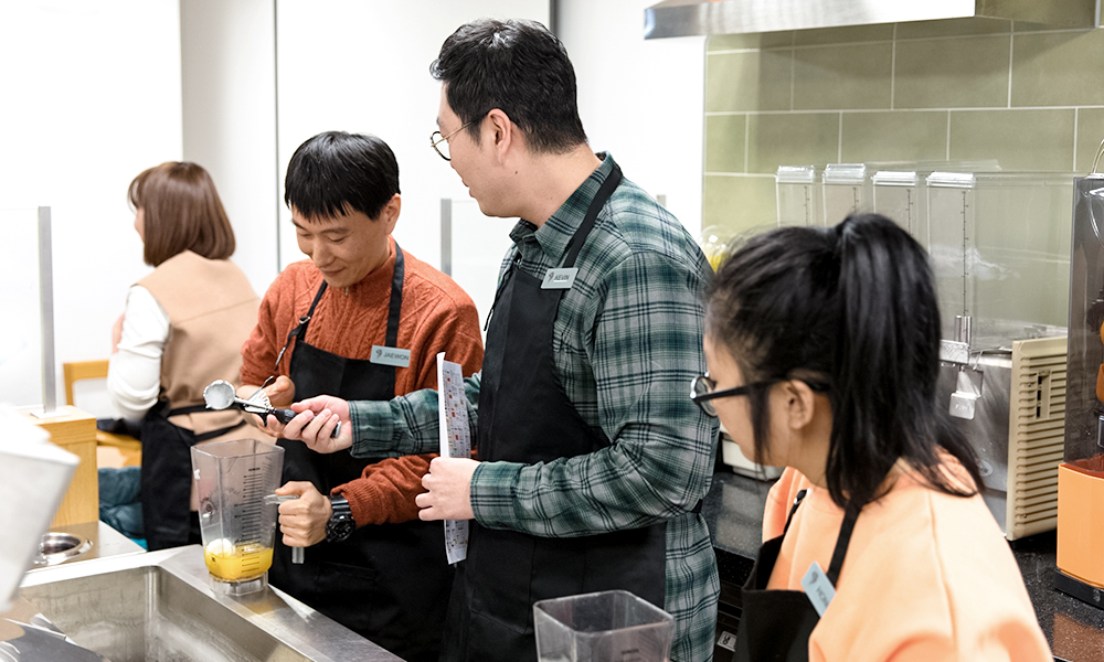 같은 시각 옆 강의장에서는 신선한 과일 향 가득한 잠바주스의 ‘행복한 스무디 교실’ 수업이 진행되었습니다. 장애인 바리스타 교육생 6명을 초청해 신선한 생과일로 만드는 잠바주스의 판매 음료를 직접 제조해보는 시간을 가졌는데요. 밝고 건강한 잠바주스처럼 교육생들 모두 적극적이고 즐거운 모습으로 수업에 참여했습니다. 오렌지, 바나나 등 착즙 과일주스는 물론, 과일을 활용한 따뜻한 차, 다양한 재료로 만드는 스무디 등 평소에 접하기 어려운 다양한 음료들을 만들어볼 수 있다는 점에서 많은 관심을 보이기도 했습니다.