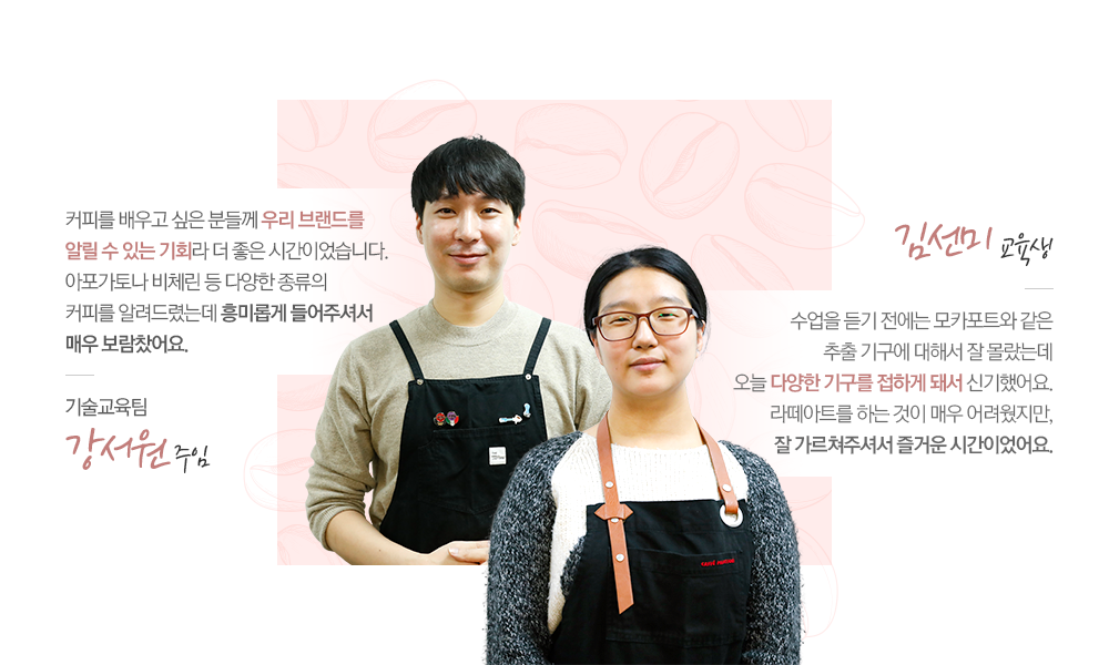 평소 바리스타에게 전문 교육을 받기 어려운 분들도 다양한 교육을 통해 커피 추출에 대한 기술을 습득할 수 있는 기회인데요. 이 날 교육에 참석한 6명의 장애인 바리스타는 파스쿠찌 바리스타의 도움을 받아 원두를 직접 갈아 커피를 내리거나 모카포트 추출, 라떼 아트 제조 등 어느 때보다 진중한 모습으로 수업에 참여했습니다. 유쾌한 수업을 마친 후 교육을 담당했던 파스쿠찌 기술교육팀 강서원 주임과 교육생으로 참여한 김선미 교육생을 만나보았습니다.