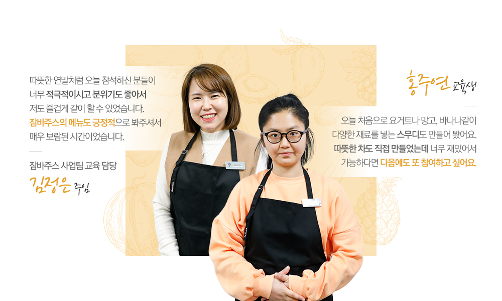 잠바주스의 행복한 스무디 교실은 음료 제조부터 간단한 서비스 교육, 과일 별 영양 정보를 담은 이론 교육까지 잠바주스 현직 근무자의 세심한 지도로 진행되는데요. 커피 교육과는 또 다른 매력으로 장애인들의 취업과 자립에 도움이 될 수 있도록 2014년부터 꾸준히 프로그램을 운영하고 있습니다. 올해도 건강하고 즐거운 분위기 속에 교육을 마친 잠바주스 사업팀 교육 담당 김정은 주임과 홍주연 교육생을 만나 소감을 들어보았습니다.