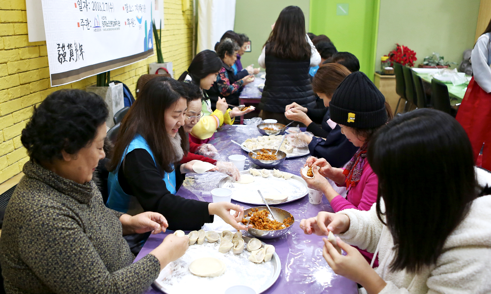 임직원과 어르신들이 함께 만두를 빚고 있는 모습