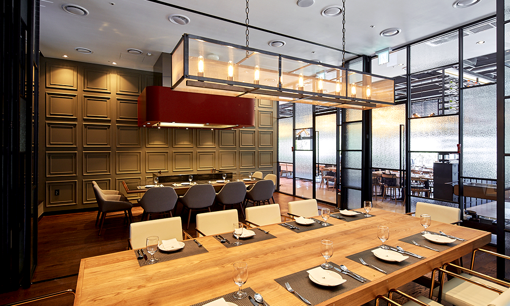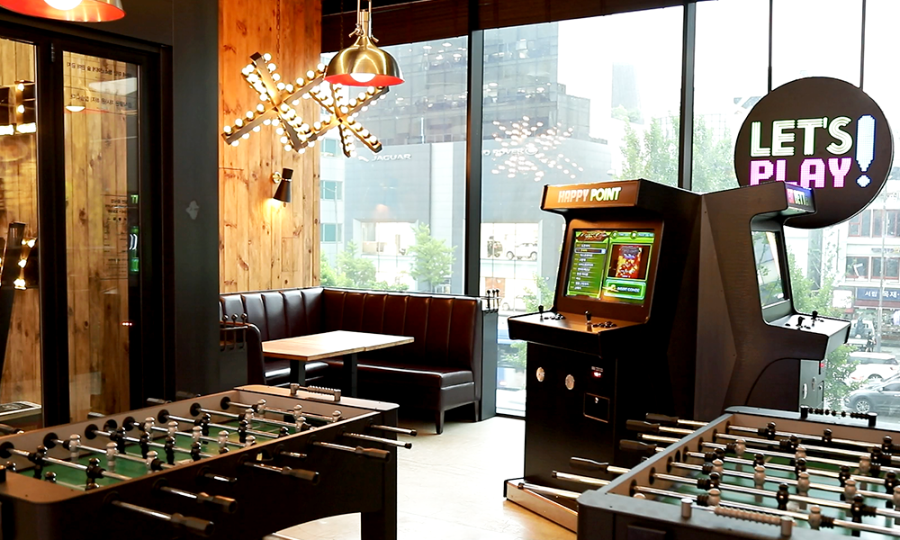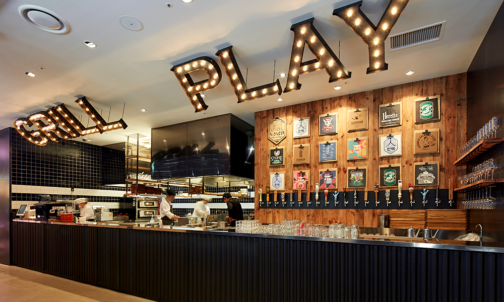 이탈리안 캐주얼 레스토랑 라그릴리아에 ‘펀(fun)’ 요소를 접목해 더욱 밝고 흥겨운 분위기를 전하는 라그릴리아 그릴&플레이에는 추억의 아케이드 게임기, 테이블 축구게임, 디지털 주크박스 등이 설치된 ‘게임존’이 있습니다. 게임존 옆에 마련된 ‘크래프트 비어 바(Craft Beer Bar)’에는 다양한 수제 맥주 탭이 벽면을 가득 채우고 있습니다. 이곳에서는 자몽의 상큼함과 맥주의 쌉쌀함이 조화를 이루는 골든 에일 맥주, 인(人)맥을 꼭 맛보아야 합니다. 라그릴리아 그릴&플레이에서는 ‘데판코스요리’도 만나볼 수 있습니다. 프라이빗한 공간에서 전문 셰프가 즉석에서 만들어 제공하는 철판 요리와 특별한 퍼포먼스와 함께 제공되는 ‘라이브 디저트’는 오직 라그릴리아 그릴&플레이에서만 제공되는데요. 누구에게나 기억에 남는 특별한 경험을 선사합니다.