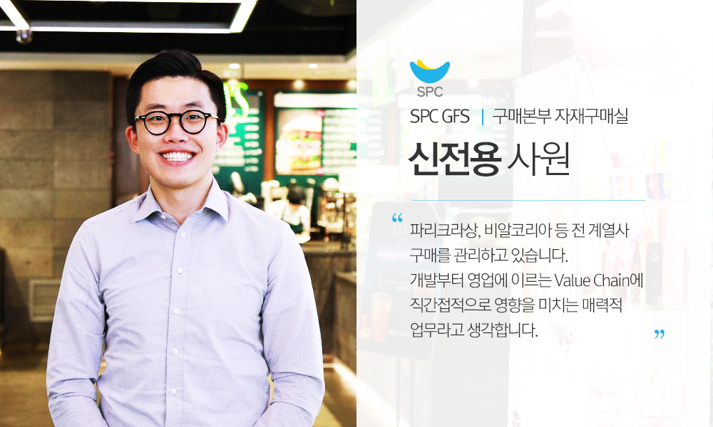 SPC GFS는 파리크라상, 비알코리아, 에스피씨삼립 등 전 계열사 구매를 관리하고 있습니다. 전사적인 구매업무를 수행하면서 다방면의 업무와 품목에 대한 경험 및 이해도를 높이고 다양한 이해관계자들과 소통하고 있습니다. 개발부터 영업에 이르는 Value Chain에 모두 직간접적으로 영향을 미치고 있어 매우 매력적인 직무라고 생각합니다.