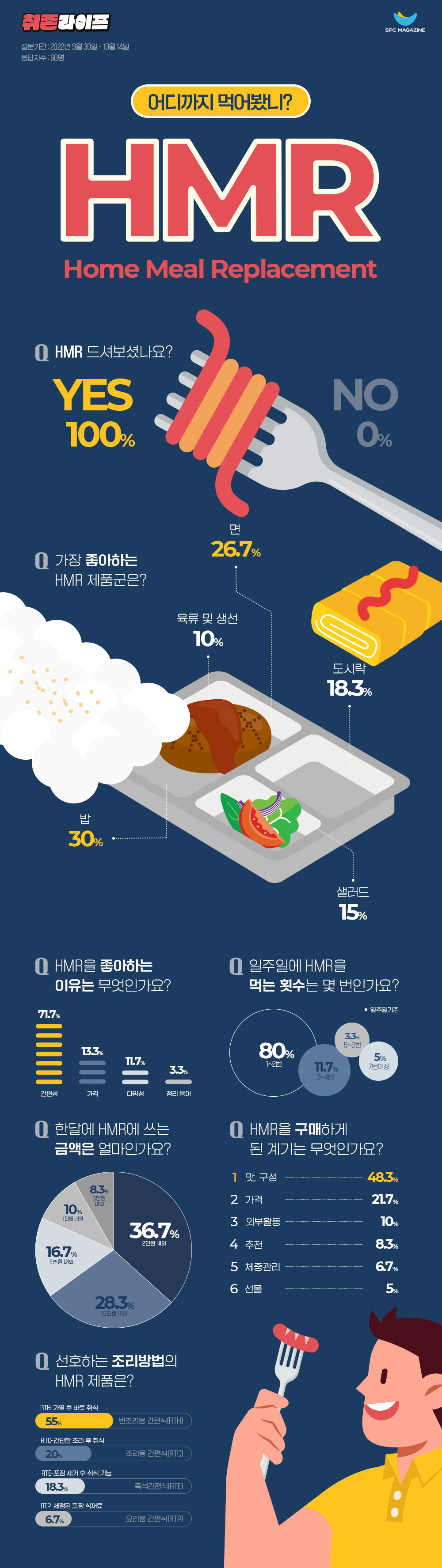 SPC매거진의 구독자분들은 HMR을 얼마나 선호하고, 구매하는지 알아보기 위해 9월 30일부터 10월 14일까지 약 2주간의 앙케트를 진행했습니다. 그럼, 아래 인포그래픽을 통해 구독자분들의 HMR에 대한 생각을 알아볼까요?