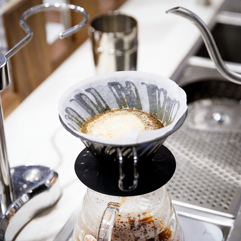 스페셜티 블렌드 커피 시음까지 마친 직원들은 ‘케맥스(chemex)’라는 추출기구를 이용해 직접 커피를 내려보는 시간도 가졌습니다. 케맥스는 1941년, 독일의 화학자 ‘피터 제이 슈룸봄(Peter J. Schlumbohm)’ 박사가 발명한 커피 추출 기구입니다. 핸들링이나 물줄기의 강약에 영향을 많이 받는 드립과 달리 초보자도 어렵지 않게 할 수 있는 것이 특징입니다. 드리퍼 리브(드리퍼 내부의 요철을 말하며 물을 부었을 때 커피가루 사이에 공기가 원활히 배출되는 통로, dripper rib)에 커피 추출물과 아로마를 가두고 공기만 빠져나가도록 설계되었으며, 곡물 성분이 함유된 두툼한 필터를 사용해 커피 찌꺼기와 잡맛을 걸러내는 것이 특징입니다.