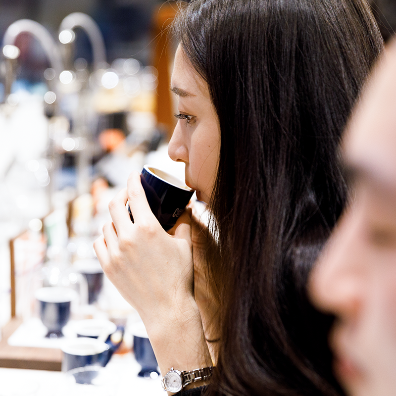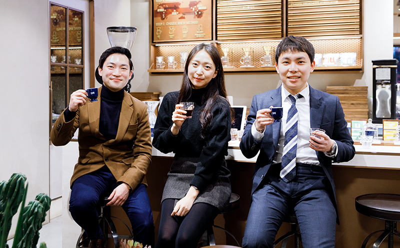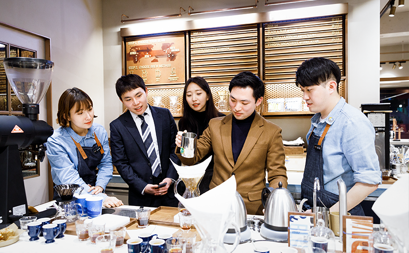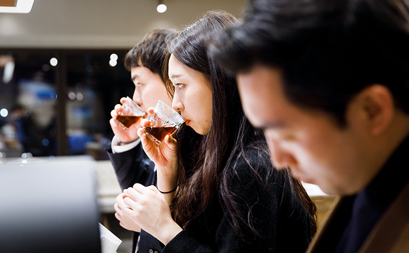 l 핸드드립으로 내린 싱글 오리진 커피를 시음하는 직원들