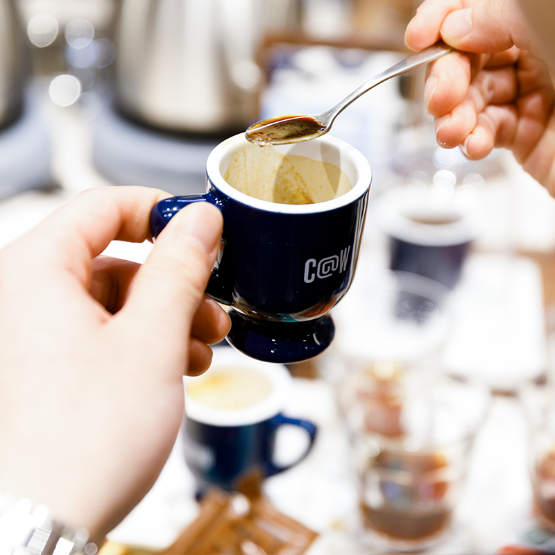 싱글 오리진 다음으로 직원들은 블렌드(Blend)를 마셔보았습니다. 블렌드는 특성이 다른 2가지 이상의 커피를 혼합한 것을 말합니다. 커피앳웍스는 서로 다른 농장에서 온 싱글 오리진들을 독자적인 배합비로 블렌딩하여, 서로 다른 개성의 2가지 스페셜티 블렌드 원두를 제공하고 있습니다. 바로 콜롬비아와 에티오피아를 혼합한 ‘에스프레소 디바(ESPRESSO DIVA)’와 콜롬비아, 에티오피아, 코스타리카, 파푸아뉴기니를 혼합한 ‘블랙앤블루(BLACK & BLUE)’입니다. 직원들은 두 블레드 원두를 브루 방식이 아닌 에스프레소로 즐겨보았는데요, 거기에 우유를 섞으면 맛이 어떻게 변하는지까지 시음해보았습니다.