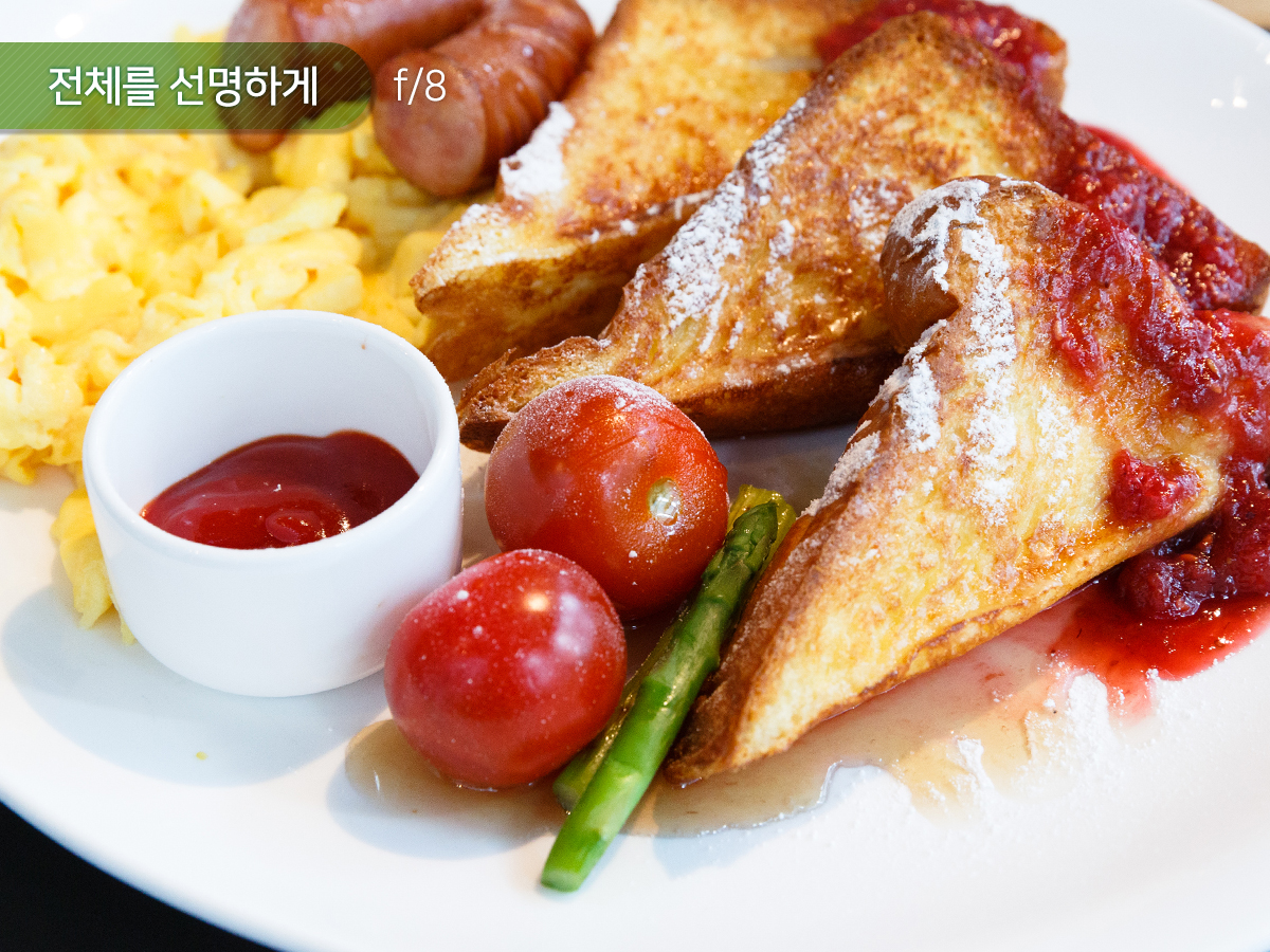 방울토마토처럼 음식의 특정 재료나 부위만 선명하게 표현하고 싶다면 카메라의 조리개를 활짝 연 뒤, 원하는 곳에 초점을 맞춰야 합니다. 그러면 방울토마토를 제외한 나머지 부분은 흐릿하게 표현됩니다. 반면에 방울토마토부터 토스트까지 음식 전체를 또렷하게 표현하고 싶다면 카메라의 조리개를 조여주시면 됩니다. 음식의 형태를 더욱 정확하게 전달하고 싶을 때 이러한 연출을 사용할 수 있습니다.