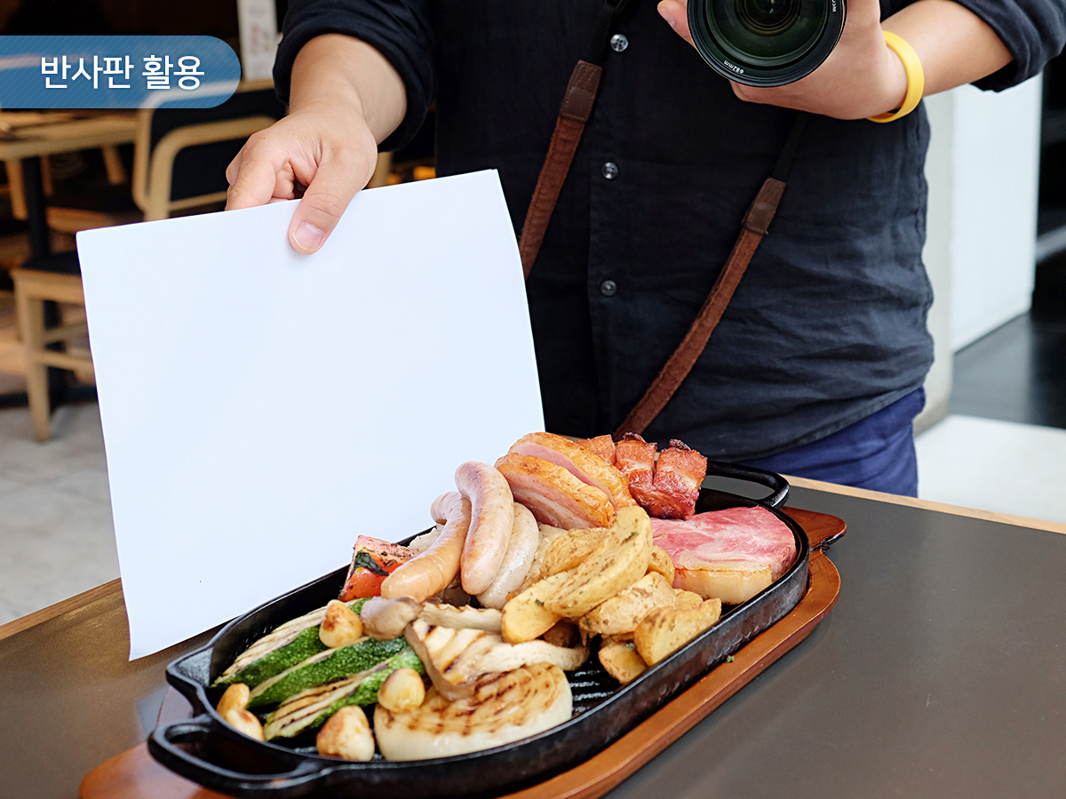 빛의 방향에 따라서도 사진의 분위기가 많이 달라집니다. 카메라 렌즈가 빛을 등지는 순광에서는 안정적인 느낌의 사진을 얻을 수 있고, 카메라 렌즈가 빛을 마주보는 역광에서는 음식에 입체감을 줘 더욱 풍성한 느낌을 얻을 수 있습니다. 이때 주변에서 쉽게 구할 수 있는 흰색 노트나, 옷, 메뉴판 등을 활용해 반사판 효과를 주면 더욱 만족스러운 결과물을 얻을 수 있다고 합니다.