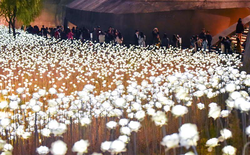 이 곳에서 연인, 가족, 친구 할 것 없이 인증사진 명소로 꼽히는 곳이 있습니다. 바로, DDP 이간수문전시장 옆 공원에 조성된 LED 장미정원 입니다. 1년 365일 저녁 7시부터 자정까지 25,550송이의 LED장미가 밝게 빛나며 장관을 이루는데, 덕분에 내·외국인 할 것 없이 누구나 인증 사진을 남기느라 정신이 없을 정도입니다.