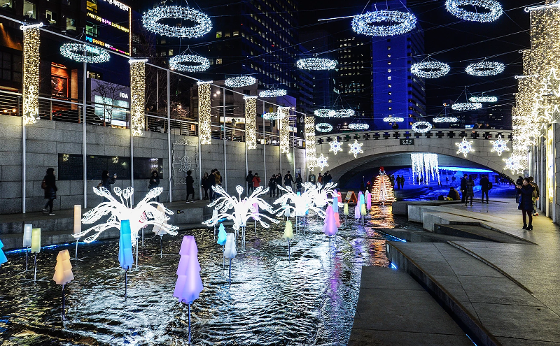 도심에서 연말 느낌을 물씬 느끼고 싶은 분들에게는 인구 천만 서울 시민의 쉼터, 청계천을 추천합니다. 청계천은 각종 문화행사부터 거리 공연까지 볼거리가 다양해 사람들의 발길이 끊이지 않는 곳입니다. 연말 청계천 일대에서는 약 3주 동안 서울의 밤을 아름다운 빛으로 채우는 ‘2017 서울 크리스마스 페스티벌’이 열립니다.