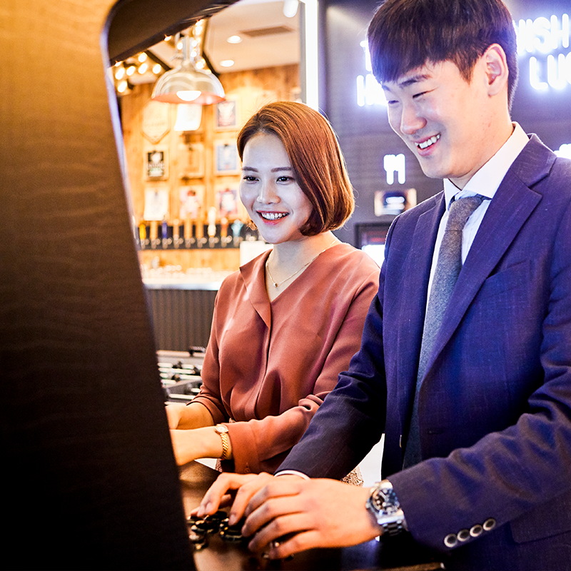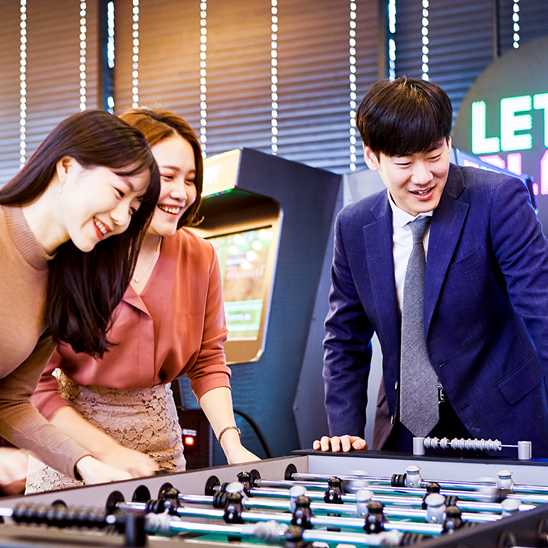 데판코스요리로 식사를 마친 3인방은 라그릴리아 그릴&플레이를 더욱 즐기기 위해 자리를 옮겼습니다. 바로 아름다운 디저트들의 향연 ‘디저트 아일랜드’와 갖가지 수제맥주 탭이 준비된 ‘크래프트 비어 바(Craft Beer Bar)’, 그리고 푸드테인먼트을 상징하는 ‘게임존’이 그것입니다. 특히 게임존에는 추억의 아케이드 오락기, 테이블 축구, 디지털 주크박스 등이 마련되어 있어, 고객들은 식사 전이나 후에도 전혀 심심할 틈이 없습니다. 3명의 SPC인은 오직 해피포인트 앱 하나만 간단하게 준비하여, 각자 좋아하는 음악을 듣거나 추억의 게임을 즐기는 시간을 가졌습니다.