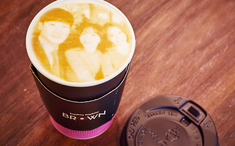 배스킨라빈스 BROWN 청담점에는 스페셜티 원두를 활용한 커피와 커피 음료 외에도 즐길 거리가 있습니다. 바로 원하는 로고와 사진을 커피 위에 인쇄해주는 ‘라떼아트 머신‘이 비치되어 나만의 ‘카페라떼’를 즐기실 수 있습니다. 이를 위해서는 스마트폰 앱스토어에서 전용앱을 설치하면 됩니다. 이후 촬영 또는 저장된 이미지를 앱을 통해 업로드하면, 해당 이미지가 라떼 윗부분에 그려져 나옵니다. 이 날 SPC 3인방은 다함께 촬영한 기념 사진을 라떼아트로 남기면서 즐거웠던 SPC플레이 체험 일정을 마무리지었습니다.