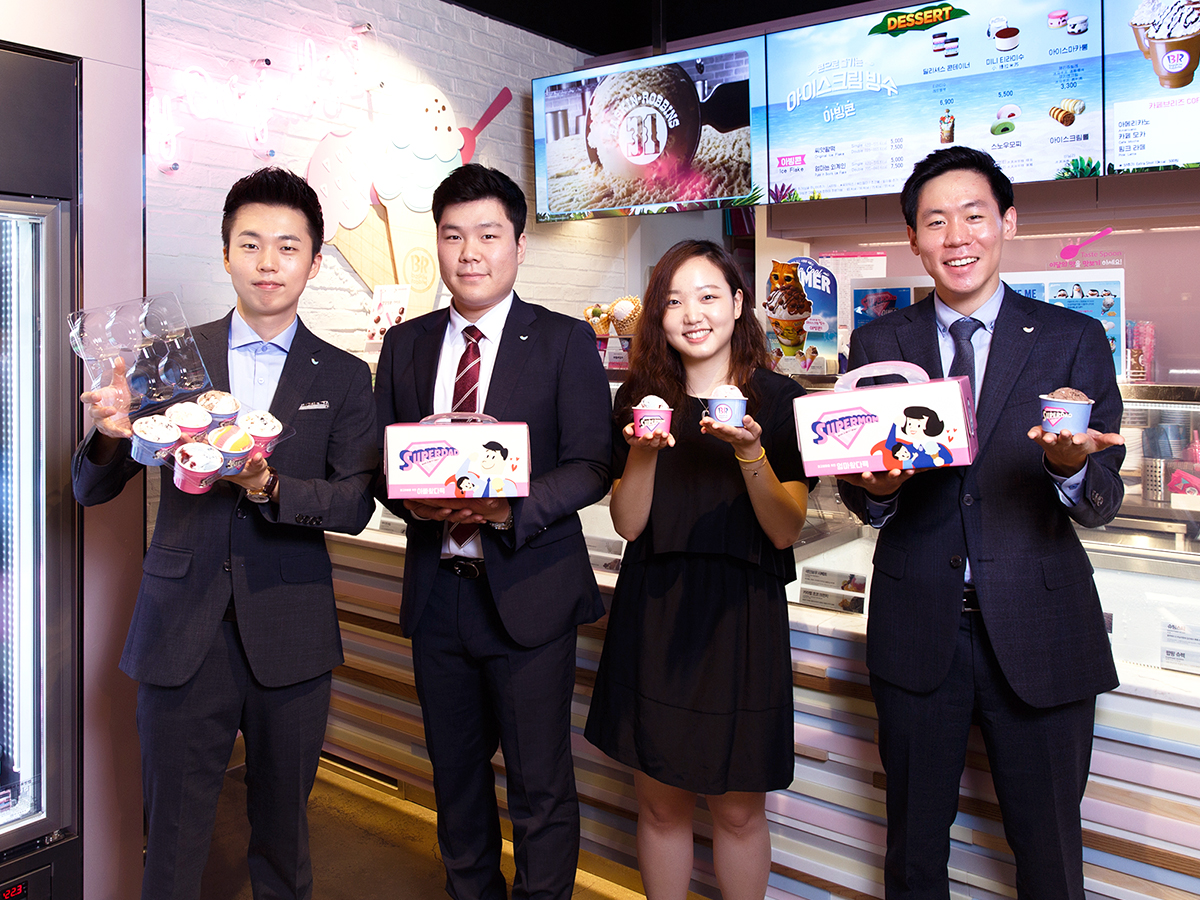 올해 초 그룹 신입사원 입문교육 팀별 과제는 ‘현장에서 아이디어를 얻어서 제품이나 프로모션을 제안’하는 것이었습니다. 비알코리아 신입사원으로 입사한 ‘아빠왔다 팀’ 허수준, 정영빈, 이연주, 김기찬 사원은 배스킨라빈스를 찾는 고객 중엔 본인 뿐만 아니라 아이들을 위한 아이스크림을 사러 오시는 부모님도 있다는 점을 주목했습니다.