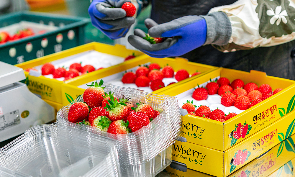 까다로운 선별 작업을 거치는 진주농·진주팜의 딸기
