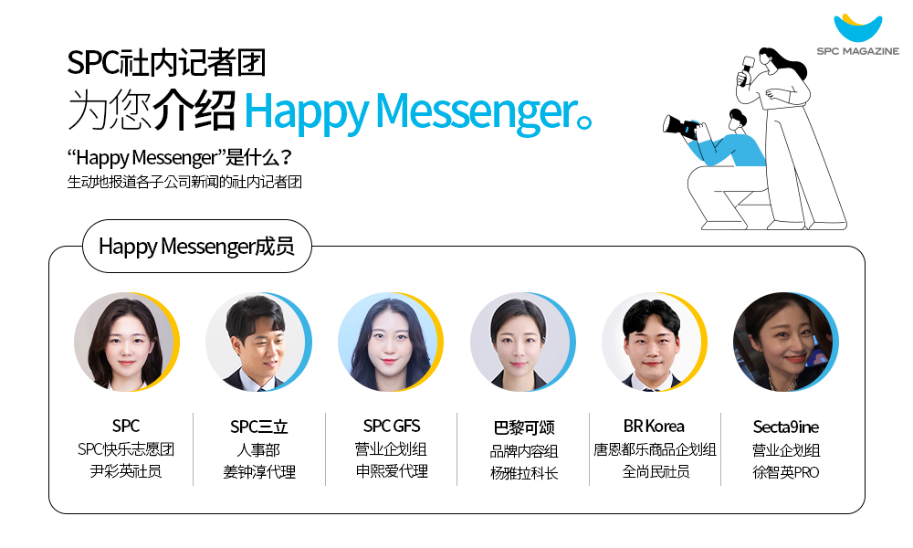 在主要的6个子公司(SPC、巴黎可颂、BR Korea、SPC三立、SPC GFS、Secta9ine)中各选拔一名员工组成的社内记者团“Happy Messenger”将从2023年7月开始到12月为止进行为期6个月的采访活动。通过每月1次的编辑会议,制作2件以上的原稿,筛选优秀企划和内容,正式刊登在SPC杂志内刊上。除此之外,每月还将通过公司内部沟通官方软件中新设的公司内部交流公告栏—“SNL(SPC News Lounge)”刊登原稿。请大家今后多多关注为了公司内部组织之间的交流而努力,作为沟通的象征而积极活动的“Happy Messenger”。