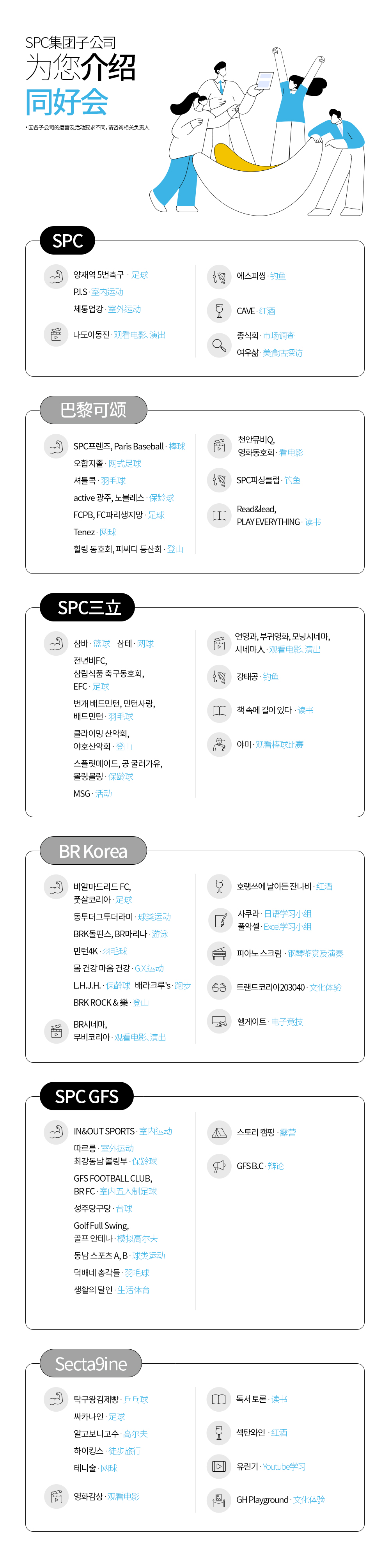 员工们可以选择加入已经在运营中的同好会,又或许,如果没有感兴趣的领域的话,也可以申请成立新的同好会。到目前为止,正在开展活动的同好会共有89个,其中SPC有8个、巴黎可颂有16个、SPC三立有21个、BR韩国有18个、SPC GFS有16个,以及Secta9ine有10个。