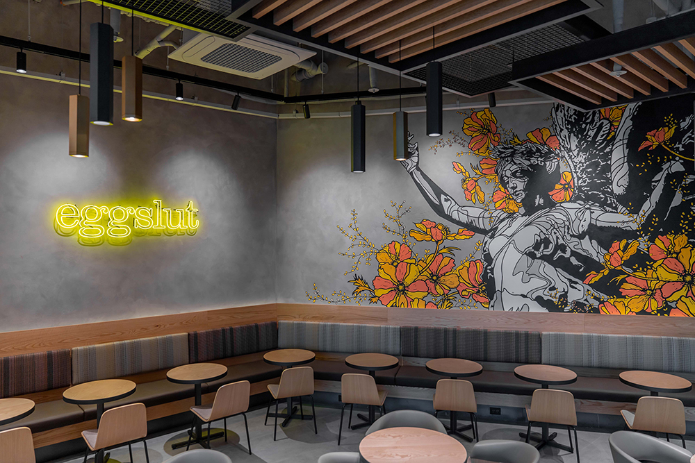 Eggslut汉南店面积290.4㎡,拥有81个座位,并具有宽敞的露台空间,提供舒适温馨的氛围。与洛杉矶代表性涂鸦(Graffiti,通过划痕或喷漆在墙壁上作画)艺术家“David Flores”合作,奉献蕴含Eggslut真实来历并独具特色的壁画(Mural)艺术。此外,还单独开拓出一个送餐取餐区,加强送餐服务。