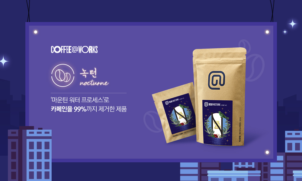 커피앳웍스는 지난 3월 ‘카페인이 없어 밤에도 어울리는 커피’라는 의미의 디카페인 원두 ‘녹턴(Nocturne)’을 출시했습니다. 녹턴은 풍부한 질감과 부드러운 산미, 초콜렛의 달콤한 풍미가 특징으로 과테말라 우에우에테낭고(Huehuetenango) 지역에서 재배한 커피 생두를 ‘마운틴 워터 프로세스(Mountain Water Process)’로 카페인을 99.9% 제거한 제품입니다. 이 마운틴 워터 프로세스는 탄소필터를 활용해 카페인만을 걸러내어 커피 본연의 향을 살려냈습니다.