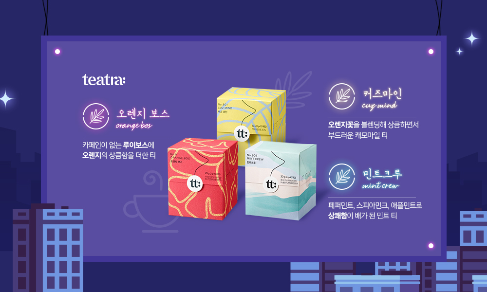 SPC그룹의 블렌디드 티(Blended tea) 브랜드 ‘티트라(Teatra)’에서는 카페인 걱정 없이 편하게 즐길 수 있는 허브티 3종 ‘민트크루(Mint Crew)’, ‘커즈마인(Cuz Mind)’, ‘오렌지보스(Orange Bos)’를 추천해드립니다.