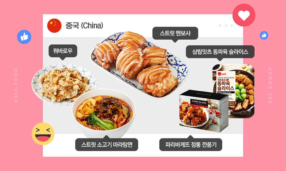 이뿐만 아니라 짧은 시간에 간편하게 조리하여 먹을 수 있는 SPC그룹의 HMR(Home Meal Replacement) 제품으로도 중국 음식을 만날 수 있는데요. ‘파리바게뜨’의 자체 프리미엄 가정간편식 브랜드인 ‘퍼스트 클래스 키친’의 ‘아시아 퀴진(Asian Cuisine)에서 출시한 ‘정통 깐풍기’와 ‘정통 짜장면’이 그 주인공입니다. 바삭하게 튀긴 닭고기를 매콤한 중국식 비법 소스에 버무려 맛있게 즐기는 ‘정통 깐풍기’와 쫄깃하고 부드러운 면발 위에 유명 중식 쉐프의 비법 춘장 소스를 얹어 추억의 맛 그대로 맛있게 비벼 먹는 ‘정통 짜장면’은 에어프라이어나 프라이팬, 전자레인지 등으로 집에서 쉽게 즐기는 별미입니다. 또한, 간편하지만 제대로 된 한 끼를 즐길 수 있는 삼립의 간편식 전문 브랜드 ‘삼립잇츠’에선 중국식 돼지고기 요리인 ‘동파육 슬라이스’를 맛볼 수 있는데요. 삼겹살을 사용해 부드럽고 쫄깃한 식감에 특제 동파육 소스가 버무려져 술안주로도 일품입니다.
