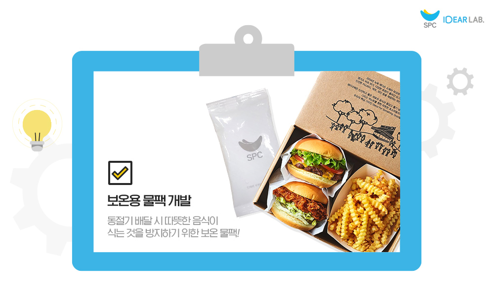 다음으로 만나볼 아이디어는 추운 동절기에 SPC그룹의 제품을 배달했을 때 음식이 식지는 않을까 하는 걱정을 덜어준 제안입니다. 바로 ‘보온용 물팩 개발’인데요. 컴팩트한 사이즈로 기존에 제작된 패키지를 바꾸지 않고 제품 밑에 놓을 수 있도록 제작되었습니다. 이 물팩 덕분에 겨울의 칼바람에도 따뜻한 음식을 고객에게 제공할 수 있게 되었습니다.