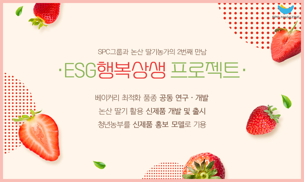 SPC그룹의 ESG행복상생 프로젝트는 코로나19로 인해 판로 확보에 어려움을 겪는 우리 농가를 돕고자 2020년부터 꾸준히 이어져 온 활동입니다. SPC그룹은 국내 농가에서 재배한 고품질의 농산물을 사들여 신제품을 개발하는데요. 이를 통해 농가는 수익 창출을 지원받을 수 있고, 고객은 우리 농산물로 만든 질 좋은 제품을 구매함으로써 가치소비에 동참할 수 있어 일거양득의 효과를 얻게 됩니다. 작년 2월, 논산시와의 협약 체결을 통해 파리바게뜨에서 선보였던 ‘논산 생딸기 케이크’, 피그인더가든에서 출시한 ‘논산 딸기 스트로베리 콥’ 등이 대표적인 사례입니다.