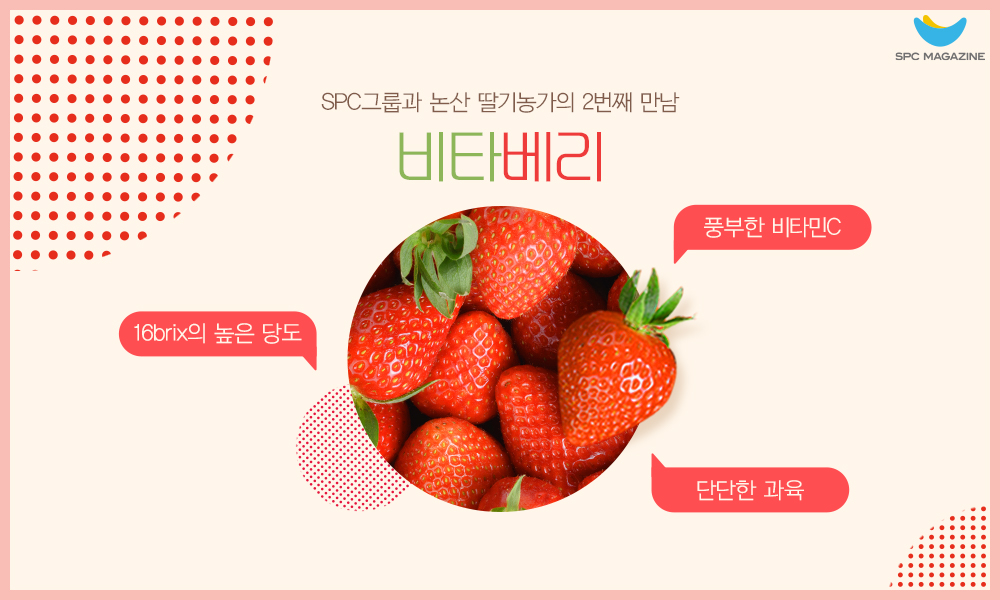 이번 ESG행복상생 프로젝트를 통해 선보이게 된 ‘비타베리’는 충청남도 농업기술원 딸기연구소가 수출용으로 2019년에 개발한 신품종입니다. SPC그룹 산하 연구소인 이노베이션랩은 2019년 1월부터 충남 딸기연구소, 논산시와 함께 비타베리를 베이커리에 특화된 품종으로 개량하고자 연구를 지속해왔죠. 비타베리는 16Brix의 높은 당도로 10~12Brix 수준인 기존 품종에 비해 단맛이 뛰어난데요. 비타민C 함유량이 많아 영양적으로도 매우 우수할뿐더러, 한층 단단한 과육과 풍부한 향을 지녔습니다.