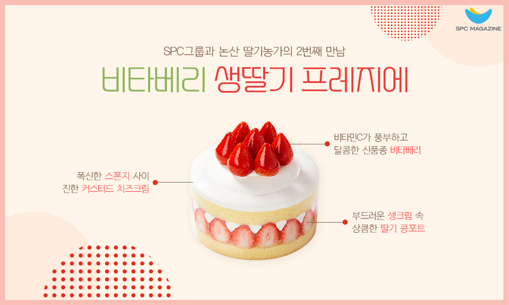 SPC그룹이 운영하는 파리바게뜨에서는 이처럼 뛰어난 품질의 비타베리를 활용해 딸기의 맛을 더욱 품격 있게 즐길 수 있는 프랑스식 케이크를 새롭게 내놨는데요. ‘비타베리 생딸기 프레지에’가 바로 그 주인공입니다. 프레지에(Fraisier)는 달콤하고 부드러운 커스터드 크림과 폭신한 스폰지 케이크 시트, 상큼한 딸기가 어우러진 프랑스식 디저트입니다.