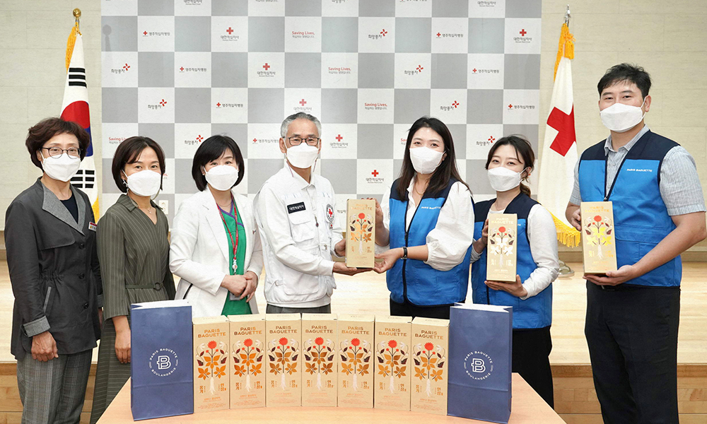 영주적십자병원에 행복상생 제품을 전달하고 있는 ㈜파리크라상 임직원들