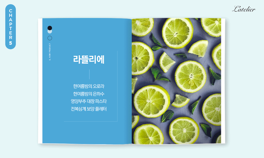 이 두 메뉴와 함께 곁들이기 좋은 모히또도 새롭게 출시되었는데요. ‘한여름 밤의 오로라’는 바다에서 온 슈퍼푸드 ‘스피룰리나’를 넣어 푸른색을 띠는 라임 모히또입니다. 스피룰리나는 바다의 해조류로 영양소가 풍부해 우주 식량으로 선정되기도 했습니다. ‘한여름 밤의 은하수’는 용의 여의주를 닮았다는 선인장 열매 ‘레드 용과’를 넣어 분홍색을 띠는 라임 모히또로 아름다운 색상으로 보는 즐거움을 더한 음료입니다. 라뜰리에에서 건강한 식재료를 활용한 신메뉴로 새로운 활력을 충전해보세요.