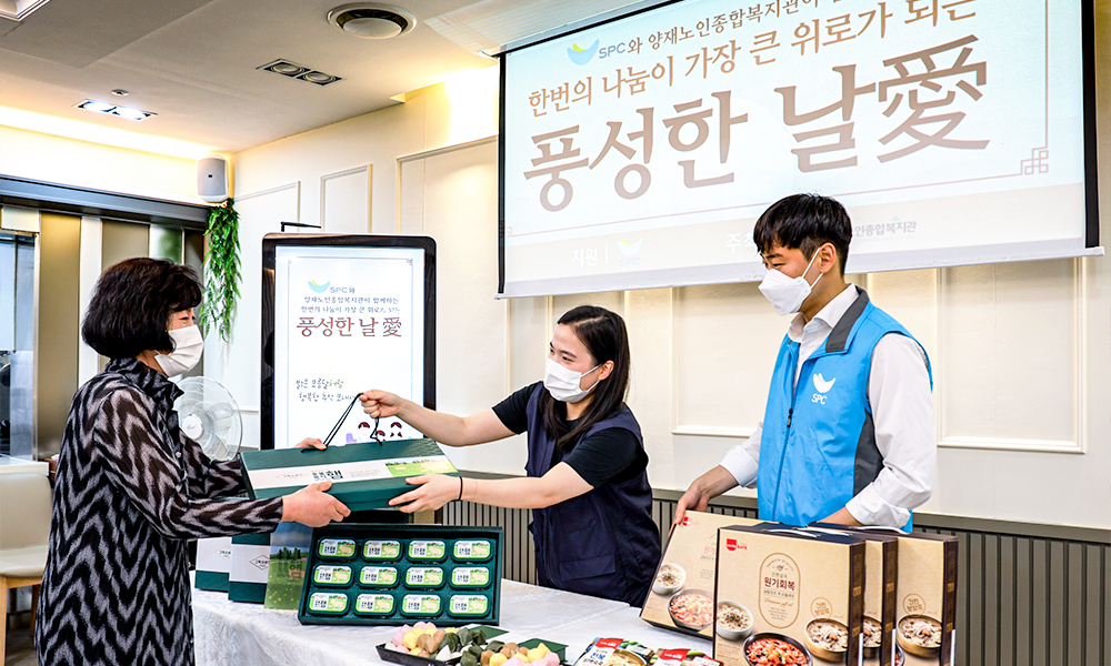 SPC그룹 임직원이 어르신들에게 추석 명절 제품을 전달하는 모습