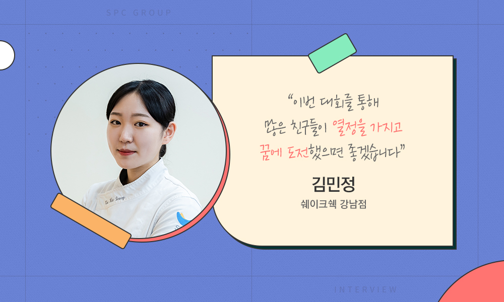 쉐이크쉑 강남점에서 일하고 있는 김민정이라고 합니다. 중학교 1학년 때부터 제과제빵을 배우기 시작해, 중학교 2학년부터 고등학교 2학년 때까지 3년간 ‘내 꿈은 파티시에 대회’에 출전했습니다. 우수상을 연속으로 수상해 장학생으로 선정되어 제과제빵 자격증을 취득할 수 있었습니다. 이후 3개월간 기업대학에서 제과제빵 교육 프로그램을 이수한 뒤, SPC그룹 직영점인 쉐이크쉑 강남점에 취업하게 됐습니다.