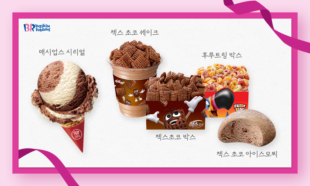 첵스 초코를 활용한 새로운 음료와 디저트도 개발했는데요. 초콜릿·바닐라 아이스크림을 섞어 만든 쉐이크 위에 첵스 초코 시리얼을 듬뿍 올린 ‘첵스 초코 쉐이크’와 쫀득한 찹쌀떡 속을 달콤한 첵스 초코 아이스크림으로 가득 채운 ‘첵스 초코 아이스 모찌’도 판매합니다. 켈로그의 유명 시리얼을 활용한 9월의 신제품으로 배스킨라빈스의 달콤한 매력에 빠져보세요.