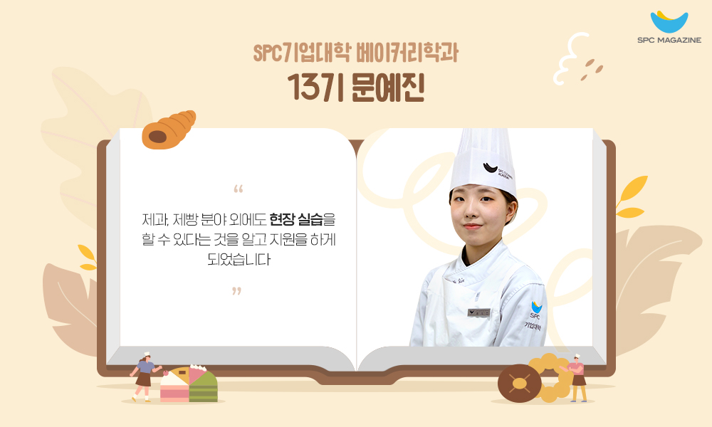 안녕하세요. SPC기업대학 베이커리학과에서 13기 부반장을 맡은 문예진입니다. 저는 인천생활과학고등학교 조리학과 3학년 재학 중 취업으로 진로를 정한 뒤 평소 관심이 있던 제과·제빵 분야와 관련된 기업을 알아보고 있었습니다. 그러던 와중에 학교 선생님께서 SPC기업대학을 추천해 주셨는데요. 현장에 나가 일하기 전에 실무와 관련된 부분들을 배울 수 있다는 점이 저에게 가장 매력적으로 다가왔습니다. 특히 파리크라상, 파리바게뜨 제품 위주로 다양한 실습을 해볼 수 있어서 기업대학 프로그램에 지원하게 되었습니다.