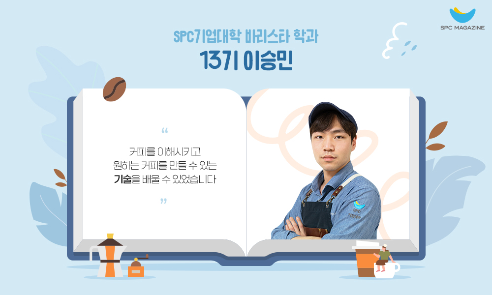 안녕하세요. 저는 SPC기업대학 바리스타학과 13기 열정맨 이승민이라고 합니다. 대림대학교 글로벌 외식 조리학과에 재학하던 중 교수님께 추천을 받아 기업대학에 입학하게 되었습니다. 추천을 받기 전에도 기업대학에 대해 알고는 있었지만, 자세한 커리큘럼은 몰랐는데요. 바리스타학과에서는 커피에 대한 기본 지식 외에도 추출 기구 사용법, 스페셜티 이론 등 깊이 있는 교육이 이뤄진다는 얘기를 듣고 지원하게 되었습니다.
