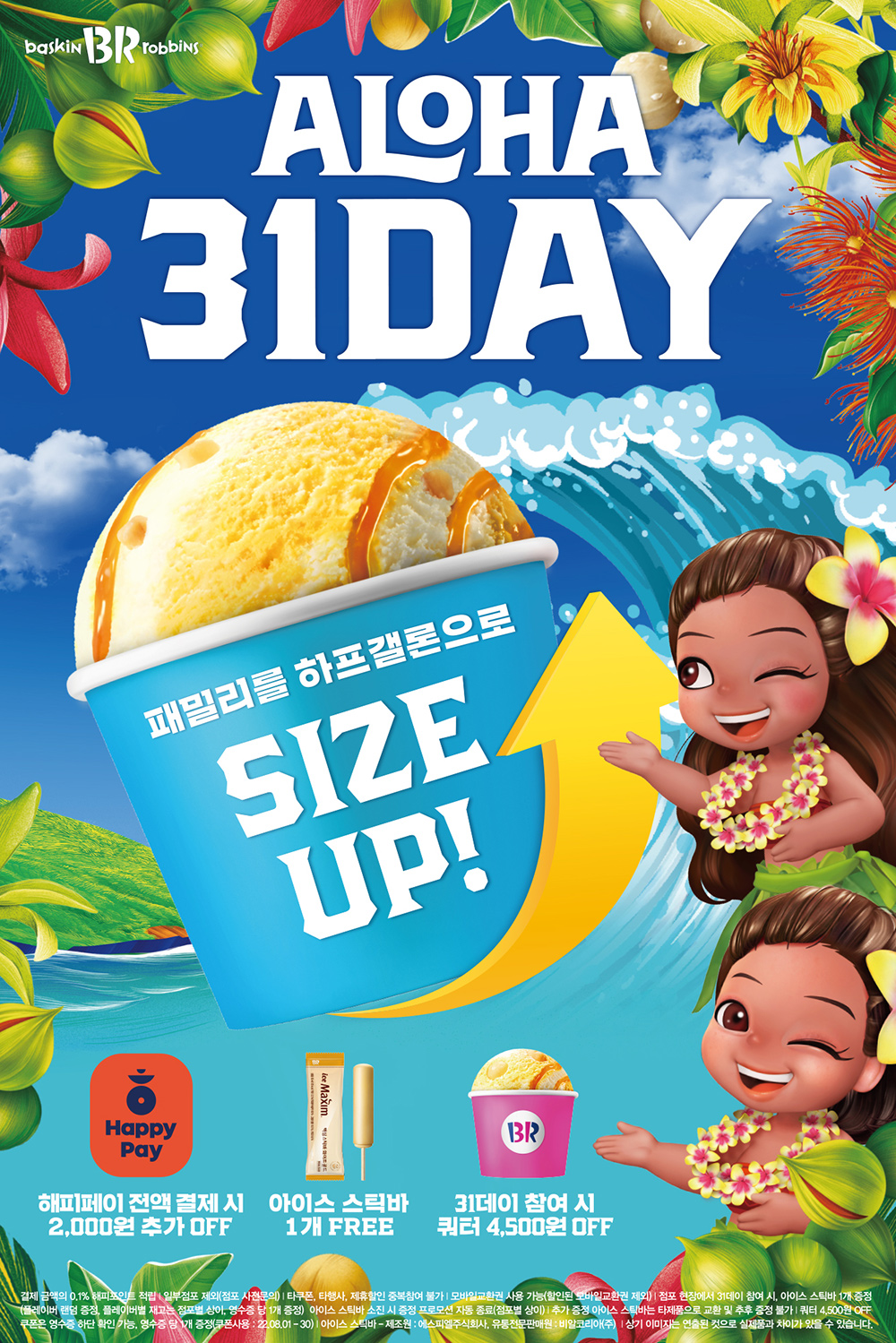 ‘알로하 31데이’는 오는 31일 하루 동안 패밀리(24,000원) 제품을 구매하면 하프갤론(29,000원)으로 사이즈를 업그레이드 해주는 것은 물론 풍성한 추가 혜택까지 제공하는 행사다. 먼저, 배스킨라빈스 오프라인 매장에서 행사에 참여하는 모든 고객에게 ‘아이스 스틱바’ 1개를 랜덤으로 무료 증정한다. 또, 영수증 하단에는 8월 1일부터 30일까지 사용 가능한 ‘쿼터 사이즈 4,500원 쿠폰’을 제공해 혜택을 더했다. 간편결제 서비스 ‘해피페이’로 행사 제품을 결제하면 2천원 할인 혜택도 제공한다. (단, 타 쿠폰, 타 행사 및 제휴할인 중복 참여 불가)