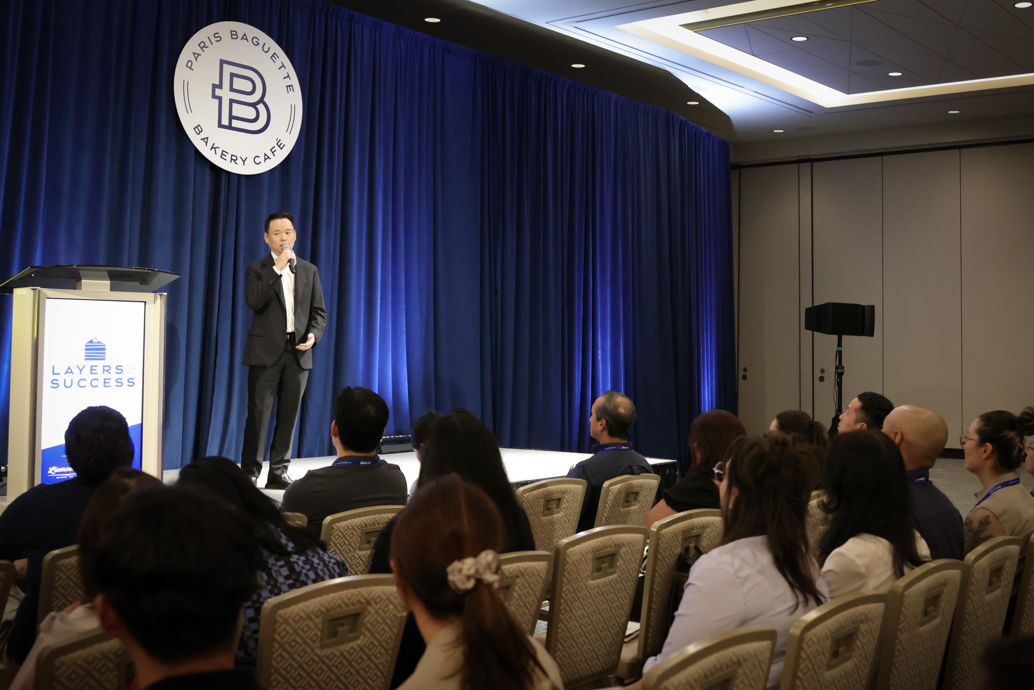 (사진캡션 1~3) 미국 라스베이거스 리조트월드에서 현지 파리바게뜨 가맹점들을 대상으로 열린 '2024 파리바게뜨 프랜차이즈 컨벤션'에서 허진수 파리크라상 사장이 인사말을 하고 있다.