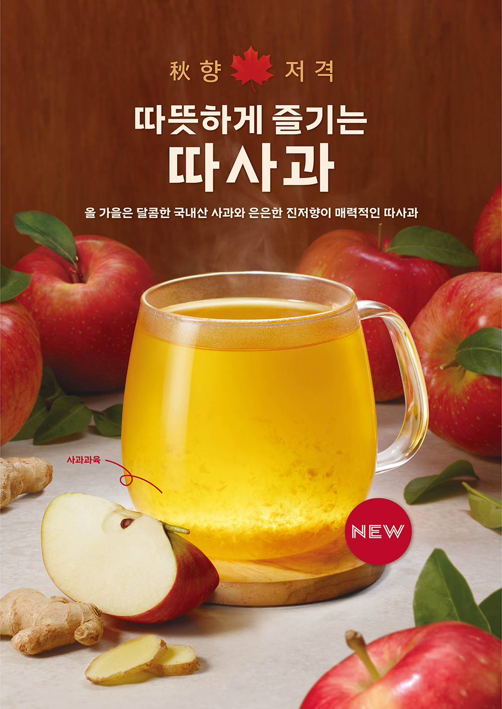 – 국내산 사과의 달큰한 맛과 은은한 진저향을 느낄 수 있는 따뜻한 사과음료