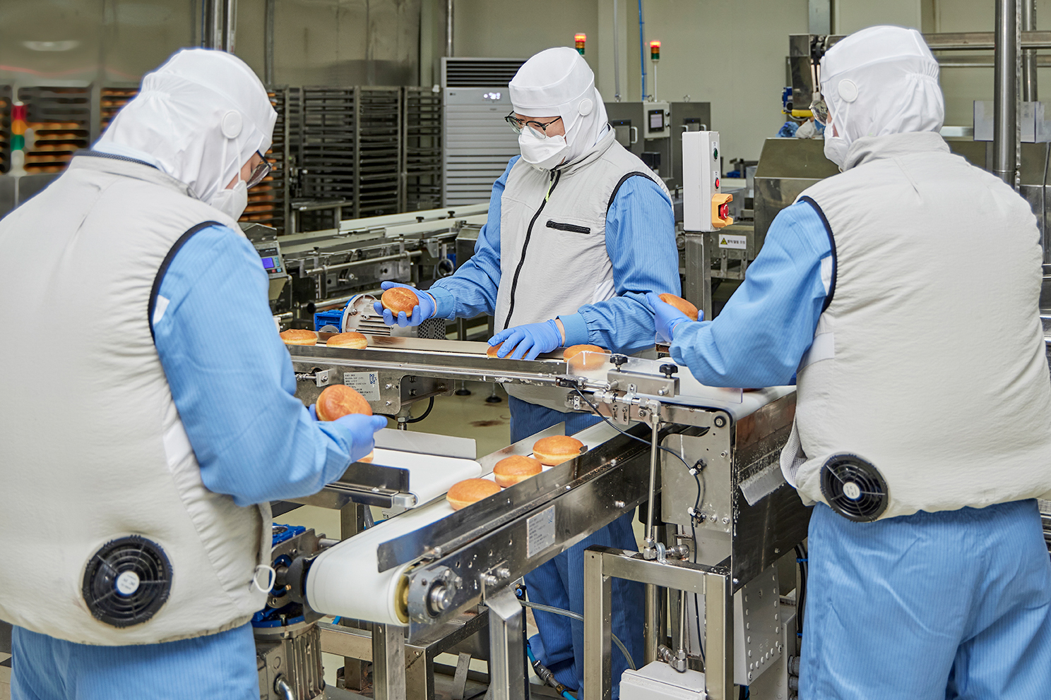 파리크라상•비알코리아의 생산 현장에는 착용감과 냉방 지속력을 높인 ‘경량형 냉풍조끼’를 지급했다. 조끼에 소형 선풍기가 달려 있는 보냉장구로 얼음팩 등을 사용하는 일반 냉조끼에 비해 가볍고, 축축함이 없어 현장 직원들의 만족도가 높다.