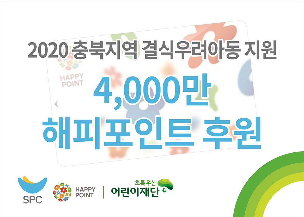 SPC그룹은 초록우산어린이재단과 함께 충북지역 내 저소득가정 아동 310명과 아동복지시설 30곳을 위한 해피포인트 적립 카드를 전달했다. 이번 지원을 통해 코로나19로 인한 개학 연기 등으로 급식 지원을 받지 못하는 아이들은 해피포인트를 파리바게뜨, 배스킨라빈스, 던킨도너츠, 파스쿠찌, 빚은 등 전국 6,300여 개의 SPC그룹 매장에서 현금처럼 사용할 수 있게 된다.