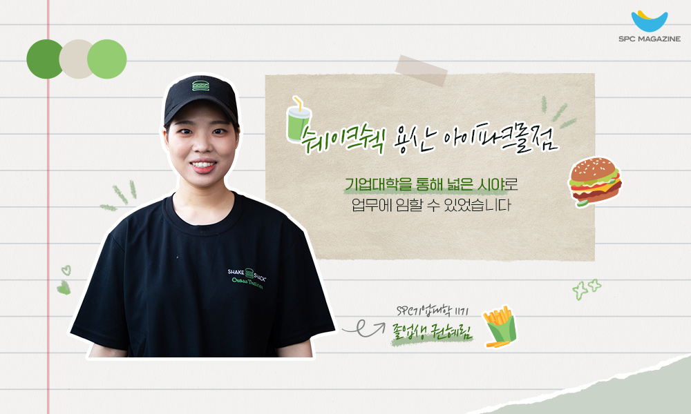 글로벌 외식산업 브랜드로서 다양한 메뉴와 제품을 출시하고 있는 SPC그룹은 최고의 교육 프로그램을 갖춘 ‘SPC기업대학’을 통해 우수한 인재 양성에도 힘쓰고 있는데요. SPC기업대학 수료 후 외식업 인재로 거듭나 쉐이크쉑 용산 아이파크몰점에 입사한 SPC기업대학 제과제빵과 11기 수료생 권혜림양을 만나 이야기를 나눠보았습니다.
