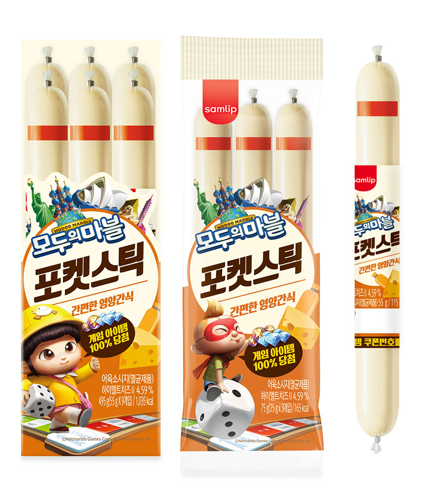 ‘포켓스틱’은 하이멜트 치즈가 4.59% 함유 되어 고소한 맛이 특징인 어육소시지다. 패키지에 ‘모두의마블’ 게임 캐릭터를 활용했으며, 낱개 제품(20g, 55g, 각 400원, 1,000원)과 여럿이서 즐길 수 있는 파우치 타입(10개입, 3,880원), 번들 패키지(3개입, 1,200원)까지 다양하게 구성하여 소비자 기호에 따라 실속있는 구매가 가능하다. 가까운 슈퍼마켓 및 이마트에서 구입할 수 있다.